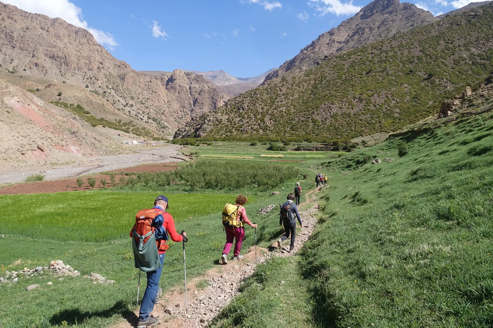Il s’agit d’un trek de 4 jours débutant dans la vallée d’Aït Bougmez (la Vallée Heureuse), passant par les azibs N’Ikkis (bergeries) avant d’atteindre le plateau de Tarkeddit, au pied du massif du M’Goun. Sur le chemin, nous rencontrons des nomades venus des vallées du Haut Atlas avec leurs troupeaux (chèvres, moutons, chameaux). L’ascension du Mont M’Goun ouvre de nouveaux horizons vers l’ensemble de la chaîne de l’Atlas et, vers le sud, vers la vallée du Dadès, le massif du Sargho et les étendues sahariennes.