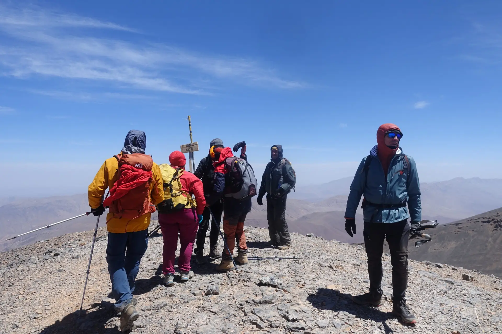 Réveil vers 4 h, départ vers 5 h pour rejoindre la longue crête de l’Ighil M’Goun, que nous suivrons jusqu’au sommet du M’Goun (4 068 m). Vue magnifique sur l’ensemble des montagnes du Haut Atlas central et, au sud, sur la vallée du Dadès et le massif du Sarhro. Après la descente par le sentier traversant un couloir, nous rejoignons le camp près des azibs d’Oulilimt (2 700 m).